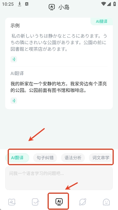 3、用户们遇到日语学习难题时,可以在AI小岛页面寻求帮助,有AI翻译功能,句子纠错功能,语法分析功能等。