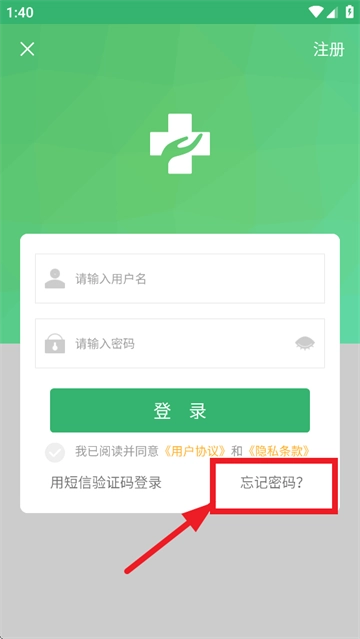 1、安装并打开健康呼伦贝尔,进入登录界面,点击忘记密码。