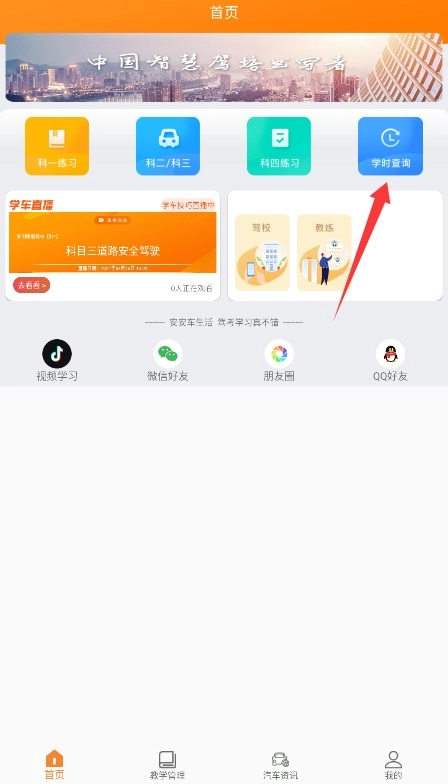 3、进入首页界面选择"学时查询"功能,即可查看各科目学习进度和已完成学时。