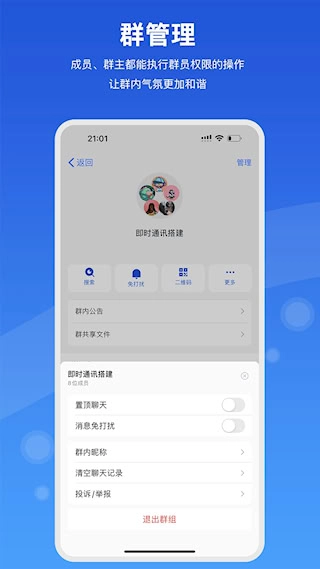 2、群组管理可容纳2000人规模,拥有群公告、禁言模式、关键词过滤等功能。能够设置入群验证问题,自动阻拦广告账号入群。