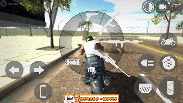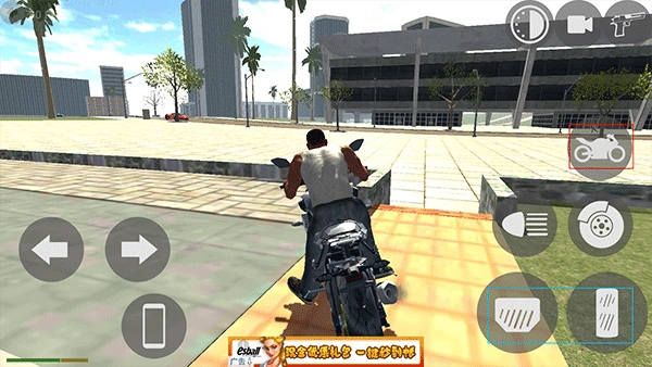 2、操作左侧的控制键,使角色移动至屋外,骑上摩托车后,点击右侧的油门与刹车键,以此来操控车辆。