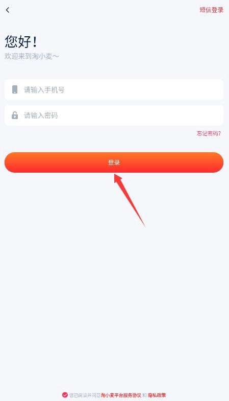 1. 首先打开淘小麦应用,在相应位置输入手机号与密码,接着勾选用户协议,最后点击登录按钮,即可进入主页面。