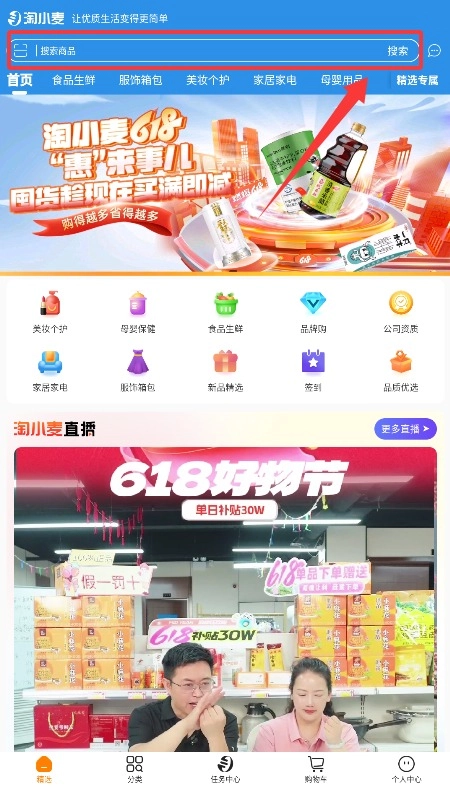 2、在首页精选商品界面,通过搜索框输入目标商品名称或关键词进行精准查找。