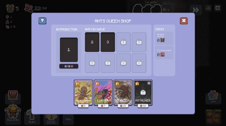 1.点击蚁后,不断地生产新的蚂蚁。