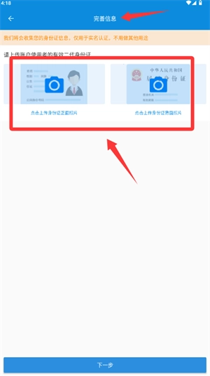 2、进入资料完善界面,依次上传身份证正反面图像,完成实名认证流程。