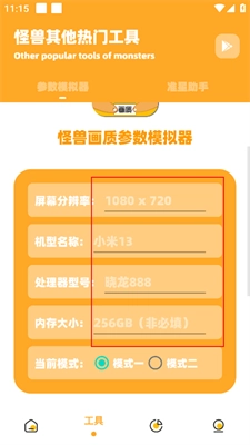 2、输入屏幕分辨率、机型名称、处理器等参数并选择模式。