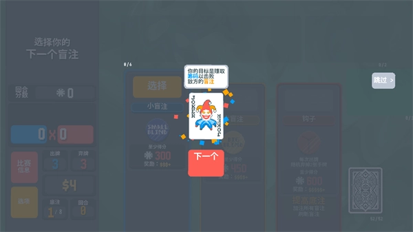 大小“盲注”关卡可跳过,玩家会获得一个奖励,但是也会失去金钱及进入商店的机会。