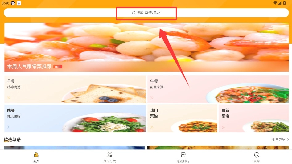 1. 开启佳肴菜谱,在首页顶端的搜索框中输入你想要制作的菜名,像“红烧肉”或者“蛋炒饭”这类。