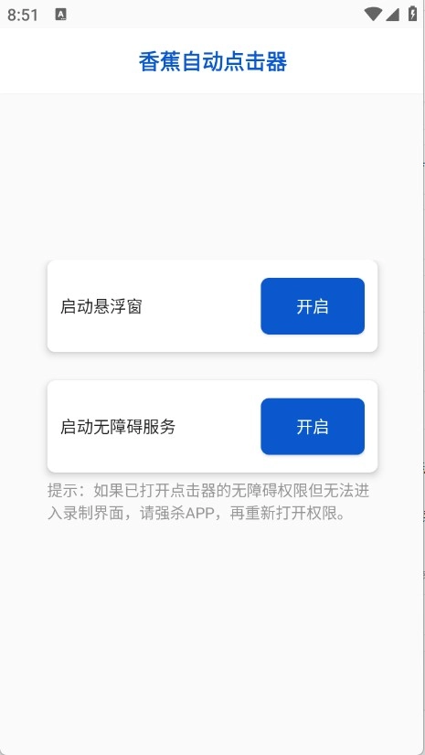 1、开启香蕉自动点击器应用程序,在使用前,必须阅读并确认隐私政策与用户协议,之后才能进入主界面。