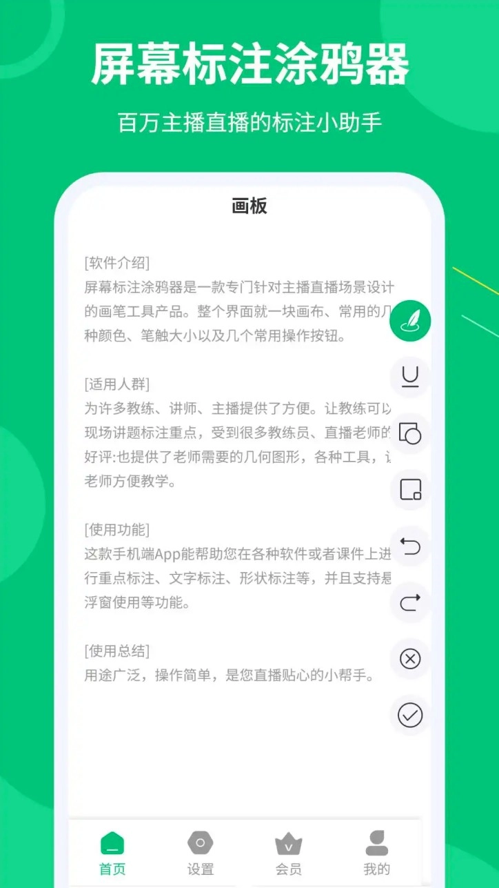 “屏幕标注涂鸦器”是一款极具实力的手机直播画笔类应用程序。它的设计初衷,是为用户在直播过程中,提供便捷高效的屏幕标注与涂鸦功能。借助“屏幕标注涂鸦器”,用户在手机直播时,能够在屏幕上展开多样化的标注及涂鸦操作,像添加文字、绘制线条、勾勒形状、插入图片等,从而契合各类不同场景的使用要求。