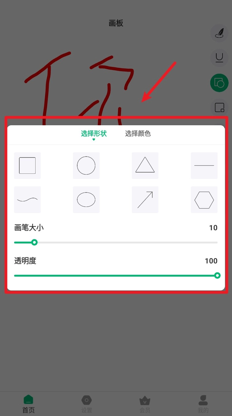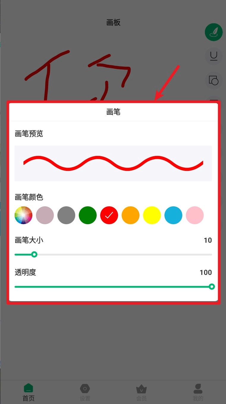 2. 点击右侧画笔图标可打开画笔设置界面,选择颜色、粗细和透明度调整笔迹效果。