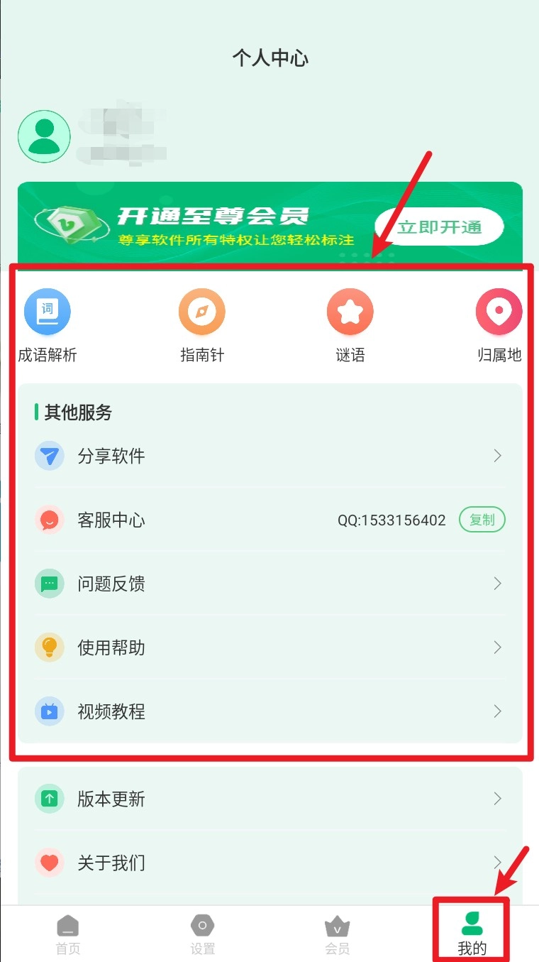 5. 切换到「我的」页面,可以进入成语解析、指南针、谜语、归属地等附加功能模块。