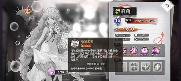必杀技的单体治疗量较为可观,行动还附带单体治疗效果。同时,能给同排队友施加buff。大招锁定血量最低的敌人,有时会产生意想不到的收尾作用。不过,它存在一定缺点,比如不一定每次都能奶到像队长这样的关键位置。而且,当多个队友都急需奶量时,茉莉不太能充分发挥作用。