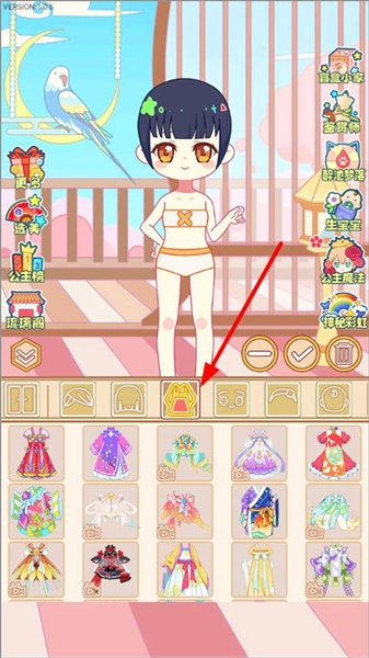 1. 开启可可公主间小游戏,进入游戏主页面,在该主页面,玩家能够看到选美、公主榜、琉璃阁、鉴赏师、公主魔法等项目,随后点击下方的换装栏。