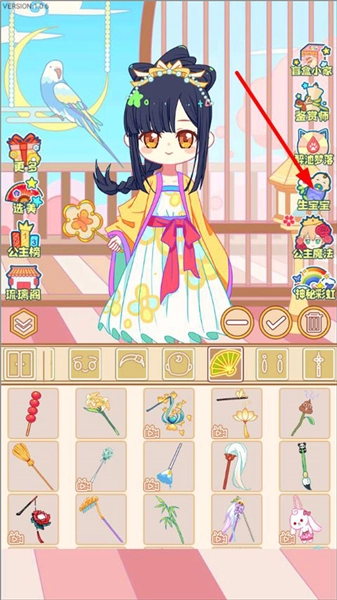 1. 开启可可公主间小游戏,进入到主页面,此页面包含盲盒、醉池、神秘彩虹、公主魔法、衣柜等元素,接着点击右侧的生宝宝按钮。
