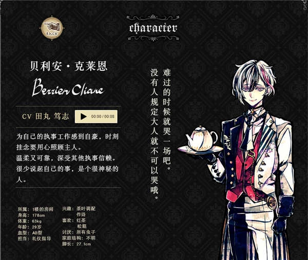 对自身的执事工作满怀自豪之情。始终将用心照料主人之事放在心上。性格温柔且值得依靠,颇受其他执事的信赖。鲜少提及自己的事情,是个充满神秘感的人。