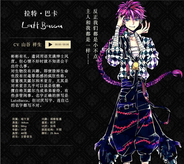 此人彬彬有礼,说话遣词尽显绅士风范,然而一旦心情不好,便可能做出难以预料之事。他对生物毫无兴趣,即便肆意毁掉生命,内心也毫无罪恶感,性格极为疯狂。他极为重视芙露尔与米亚吉,特别是对米亚吉,几乎到了依赖的程度。还擅自把芙露尔当作弟弟看待,显得有些多管闲事。他名字正确的拼写是LatoBacca ,可他讨厌写字,甚至连自己的名字都常常写错。
