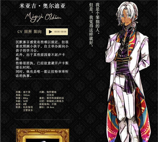 热爱美术、艺术以及美容。偶尔会被错当成女性,对此我深感厌烦,所以在言行举止上特意展现出男性的模样。在宅邸内,我能与众人正常交流,但面对宅邸外的人,就会显得极为认生。此外,对于自认为是我哥哥的拉特,我满心厌烦。