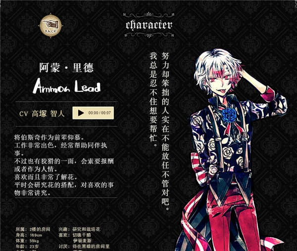 对伯斯奇怀着如对前辈般的仰慕之情。工作表现极为出色,还常常主动协助一同执事的同伴。然而,他也有狡黠之处,有时会索要报酬,或者将帮忙当作人情。他对花不仅喜爱,更是了解颇深。平日里,总会钻研花的搭配,对于自己钟情的事物,讲究至极。