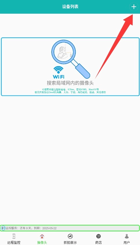 2、进入主界面后切换到"摄像头"页面,点击右上角的加号图标添加新设备。