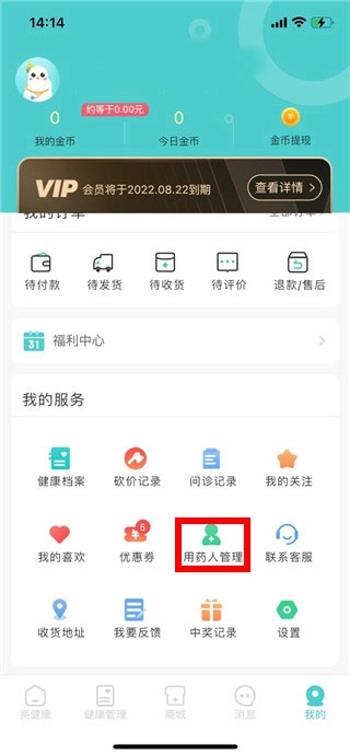 2、在个人中心页面中选择“用药人管理”;