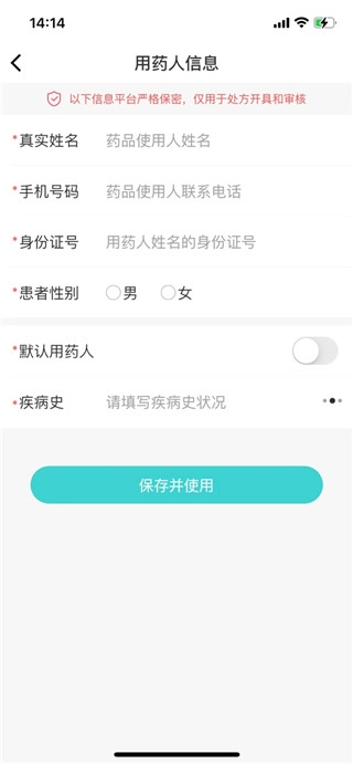 4、输入用药人的真实姓名、身份证号、联系方式等资料;