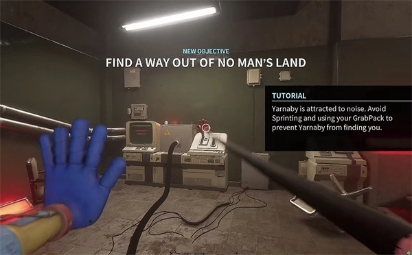 6、开门之后走里面还会有一个开关给他拉下来,往前走进去用蓝色手臂互动一下前面的开关,这里要触发三个开关才能有电流打通出口