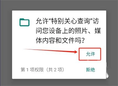 1. 第一步,在本站下载安装特别关心查询软件,点击“允许”给予软件所需权限,接着进行下一步操作。