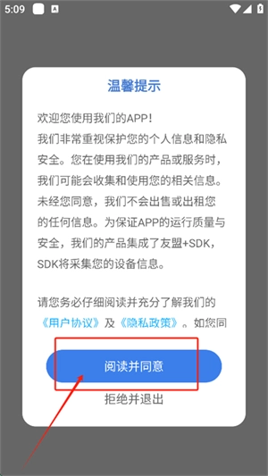 2、打开进入软件,点击阅读并同意