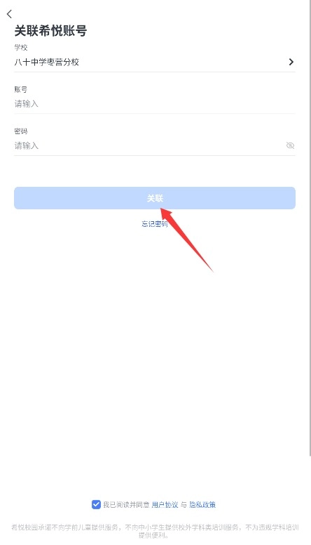 2、选择所属学校并输入账号密码,勾选同意相关协议后点击关联完成账号关联。
