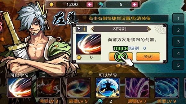 本作的技能那是相当华丽啊,不过释放技能并不会消耗蓝条,而是要消耗灵魂石,越是强力的技能消耗的灵魂石越多。主角一共能学会20个技能,不过只能携带5个上战场。其中10个技能是需要蓝玉才能购买升级的,如果没有和修改,建议只要学一个“神奇之剑”和“贵人花”。第一个技能“闪刚剑”虽然威力不足,不过胜在范围大,消耗小,尤其是击退效果显著,后期兵多将强,一不小心就会被围,来上这么一发往往能突破重围。手动党必须学习的技能有:回旋斩(砍BOSS神技),冰白镜匠(点满后是秒杀小兵神技,引上一堆小兵然后回头放一下这个技能,你懂的),魔刀斩(清小兵或者打BOSS都是不错的技能),超裂地狱(打BOSS神技,拆城门神技),手动党学满这几个技能就够了,不要再浪费金钱在其他技能上