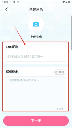 3、输入昵称、详细设定,选择好性格标签等,点击下一步即可创建