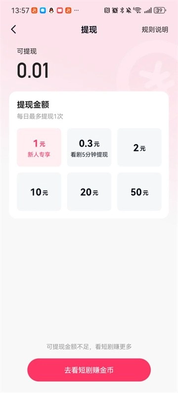本活动自【2024】年【4】月【26】日上线,截止时间以页面展示为准。二、活动玩法活动期间,完成【签到领金币】和【看短剧/看广告领金币】任务即可获得对应的金币奖励,任务要求及金币数量以活动页面展示为准。同一用户每日最多获得【10000】金币,每日提现金额上限为【50元】。