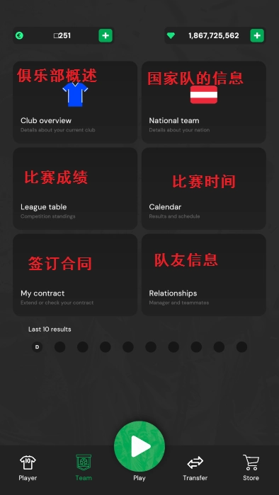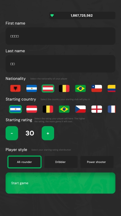 首先开始创建你的足球俱乐部,选择国家,选择初始值,还有擅长的玩法。