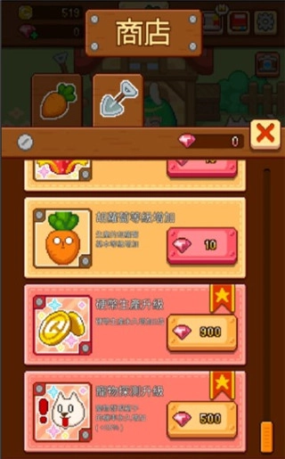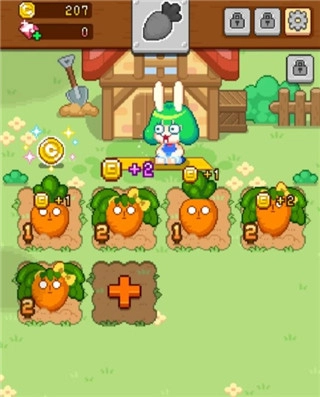 2、玩家除了能够在商店购买红萝卜之外,也可透过达成游戏中成就所获得的宝石来强化。特别是提升红萝卜初期等级的强化,可以让玩家少点很多次,这样玩家也不会容易感到累。等玩家有足够金币时还可以购买新的农场,开始培育新的农作物。