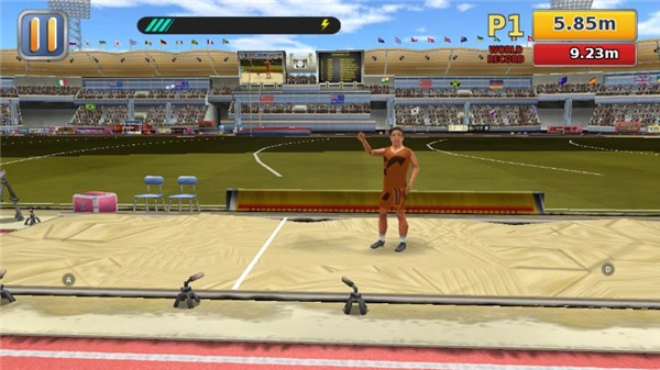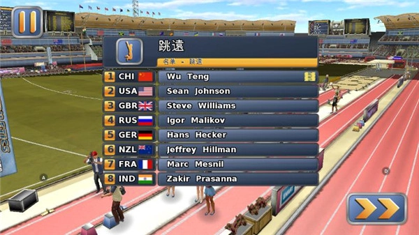 2、进入比赛后,能看到来自不同国家的参赛名单。接下来,小编以跳远项目为例,为各位小伙伴介绍一下游戏玩法。