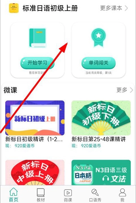1、打开日语吧,进入首页,用户可以选择标准日语教材进行学习和单词闯关,同时首页也有简单的日语课程可以学习;