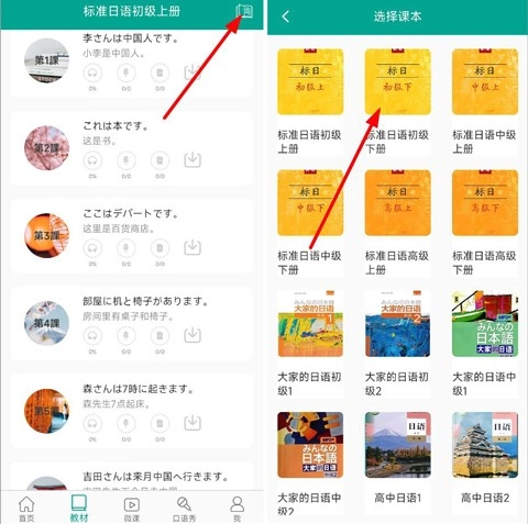2、教材页面中,点击右上角课本标志可以选择学习日语的课本;