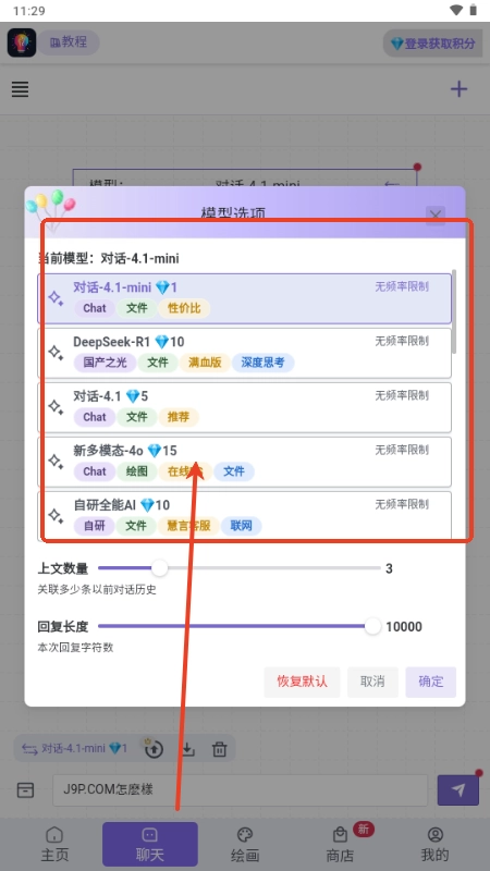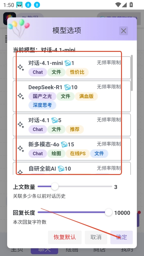 2、点击上方模型,可以切换对话模型,点击确定即可