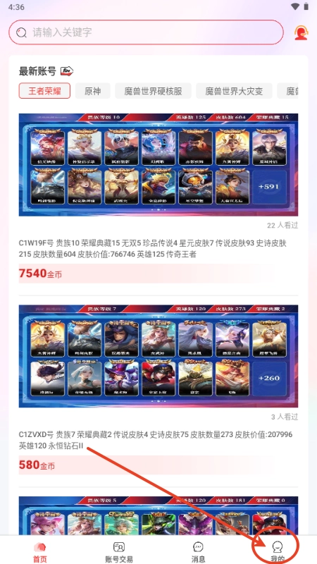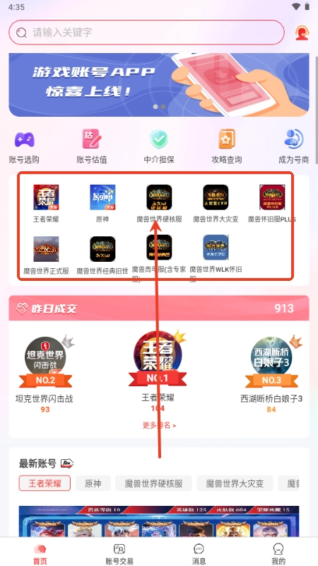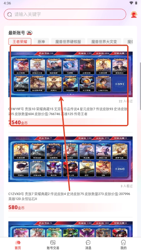 2、选择想要购买账号的游戏,浏览可供选择的账号。