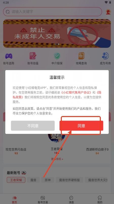 1、进入平台后,需同意相关的温馨提示,确保了解交易规则。