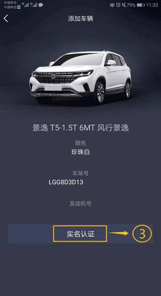 4、审核显示的车架号及发动机号无误后、点击【实名认证】;