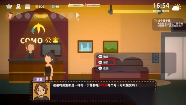 3、租房的价格为每月600元,玩家可确定租房或是讲价。