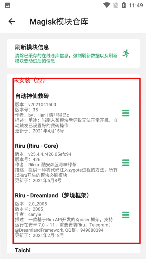 2、进入到magisk模板仓库之后,这里有很多功能框架,选择你需要的;