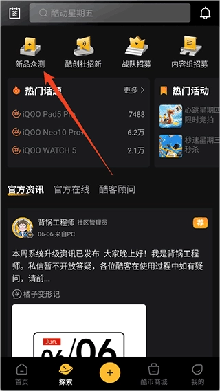 1、在用户能够进入的探索界面里,点击【新品众测】