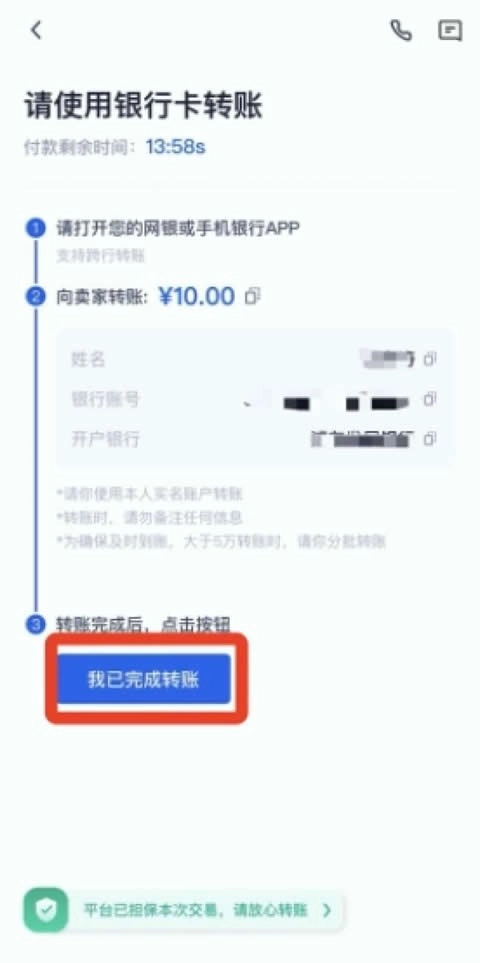 1、付款之后,需要点击页面上的【我已完成转账】按钮,对方才能给您放币。