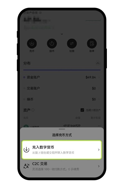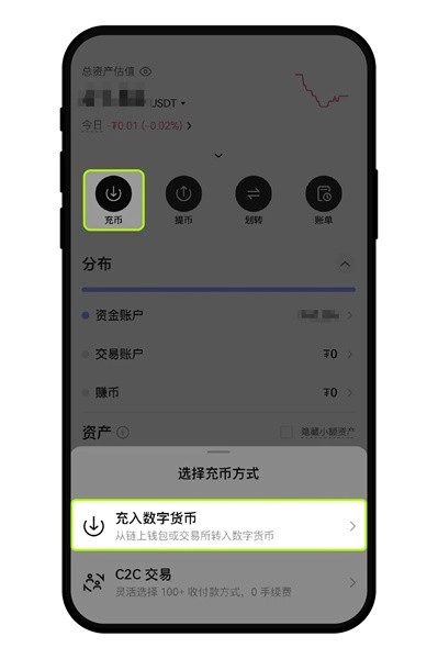 1、打开欧交易所首页,点击【资产】—【充币】—【充入数字货币】,例如选择币种【USDT】。
