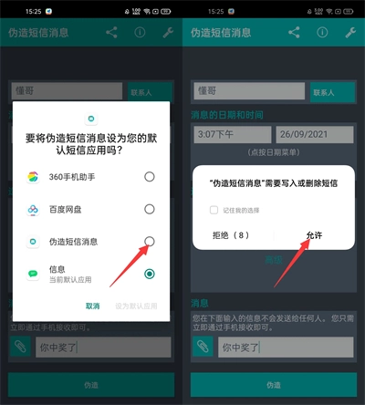 2、点击“伪造”后,会提示你需要将伪造短信信息设为默认短信应用,我们根据提示进行点击即可。