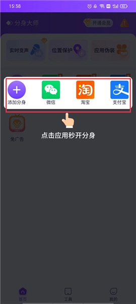 2、这里提供了很多功能,点击主页的添加分身,即可多开了;