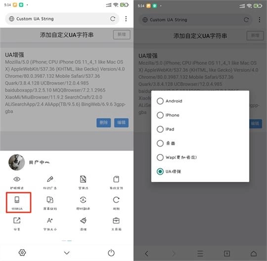 打开浏览器主菜单第二屏,找到选项“切换UA”,把刚才新自定义的UA作为浏览器默认UA。